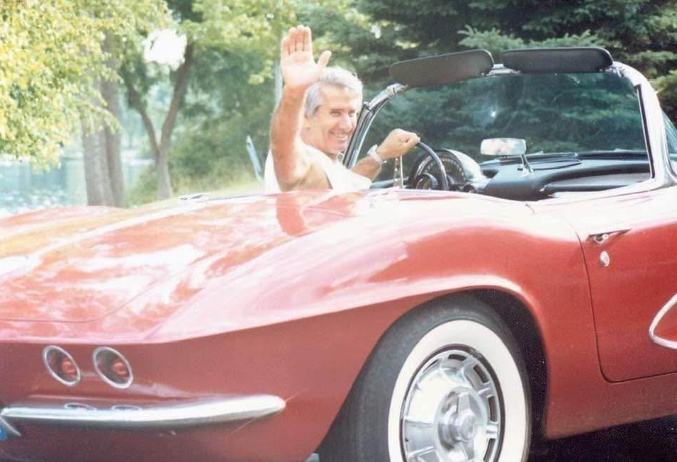 Right to left: Mom, Skip (with angry face), and me (cute haha) at the Detroit Zoo circa 1954. The train (very Art Deco) behind us was made by Chrysler and was the best part of the zoo. Next, me and Skip visiting our cousins on Long Island circa 1984. Next, me and my best friend since 1976, Michael clowning around at my wedding in 1987. Finally, my dad and (over-used I know) my hero. Pictured here in Skip’s ’61 Corvette circa 1984 and Dad in the car biz around 1952. My dad was so cool…